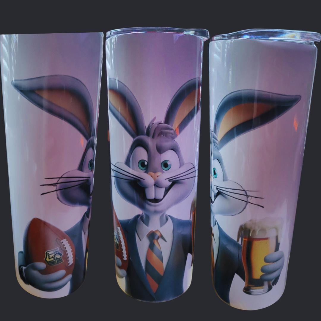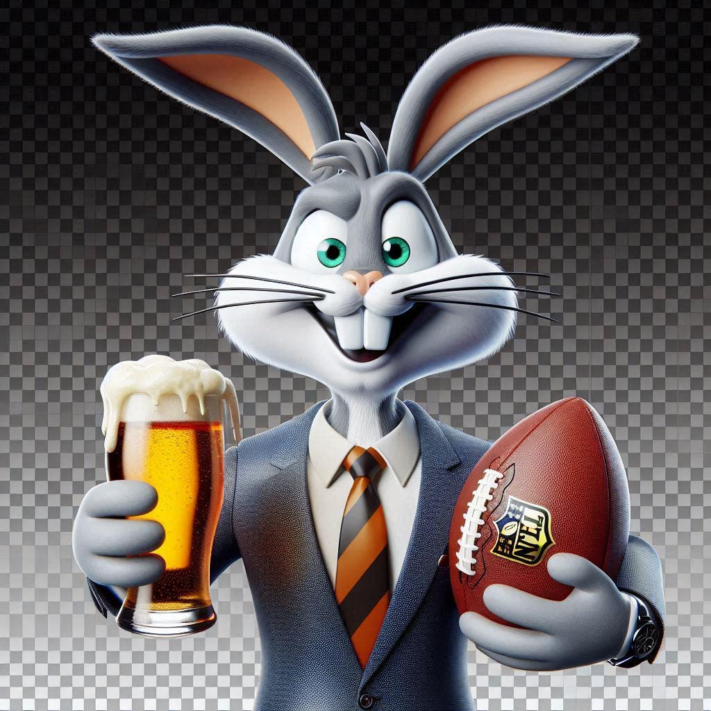 The design is Bossy dressed in a stylish blue suit with a white shirt and an orange and black striped tie. Bugs is holding an American football with a logo that appears to say "NFL" in one hand and a glass of foamy beer in the other. The combination of the football and beer with Bugs Bunny's classic charm and the formal attire makes the design both humorous and delightful. It’s quite the mashup of sports, leisure, and animated charm!