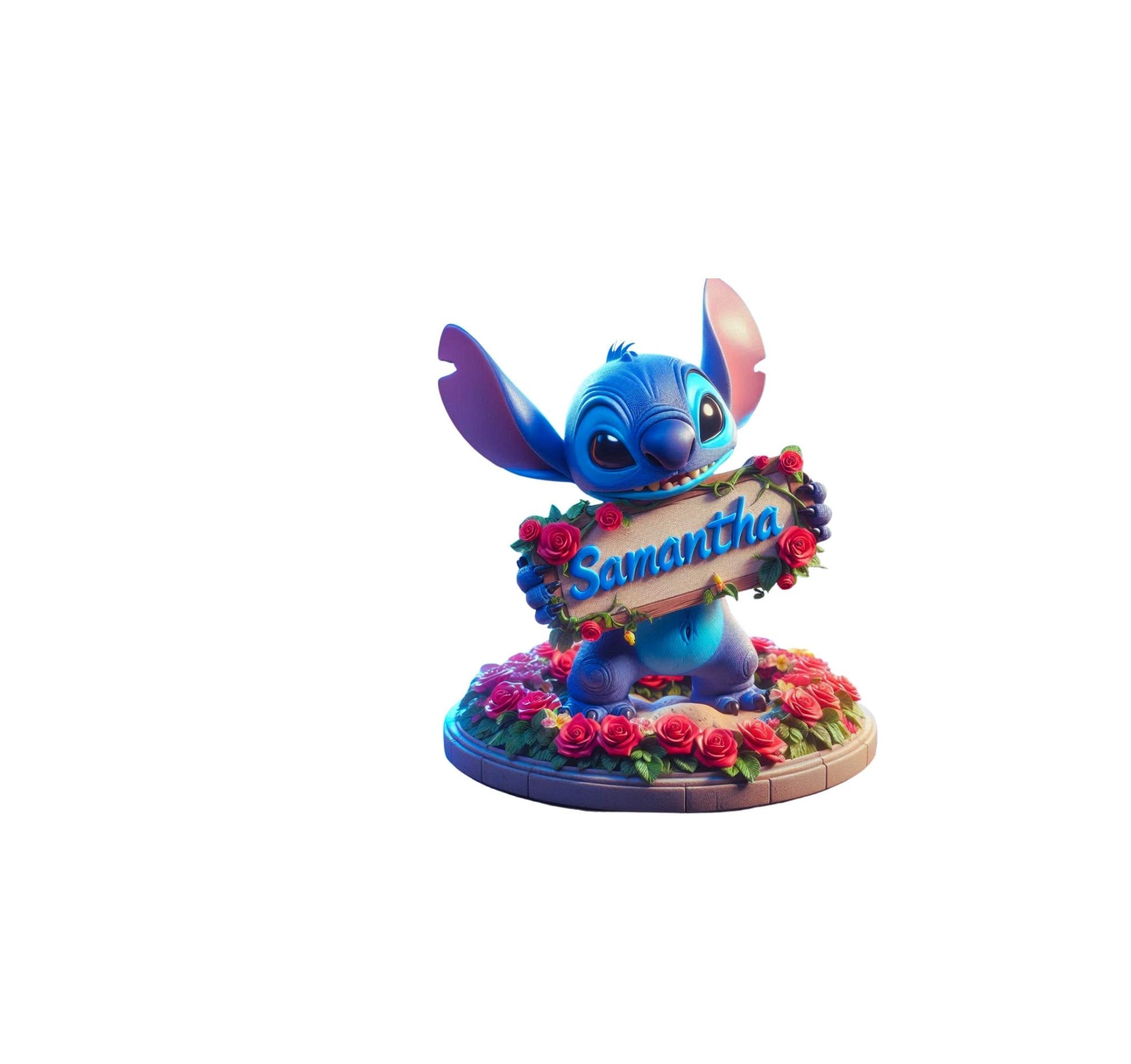 White ceramic mug adorned with a colorful design. The main attraction is the character Stitch from the Disney movie holding written "Samantha" written on it in blue letters. Surrounding the sign are vibrant red roses and green leaves, which create a lovely decorative border around the name. The plain white background of the mug makes the design stand out even more. This mug combines a beloved animated character with a personalized touch, making it a unique and customized item.