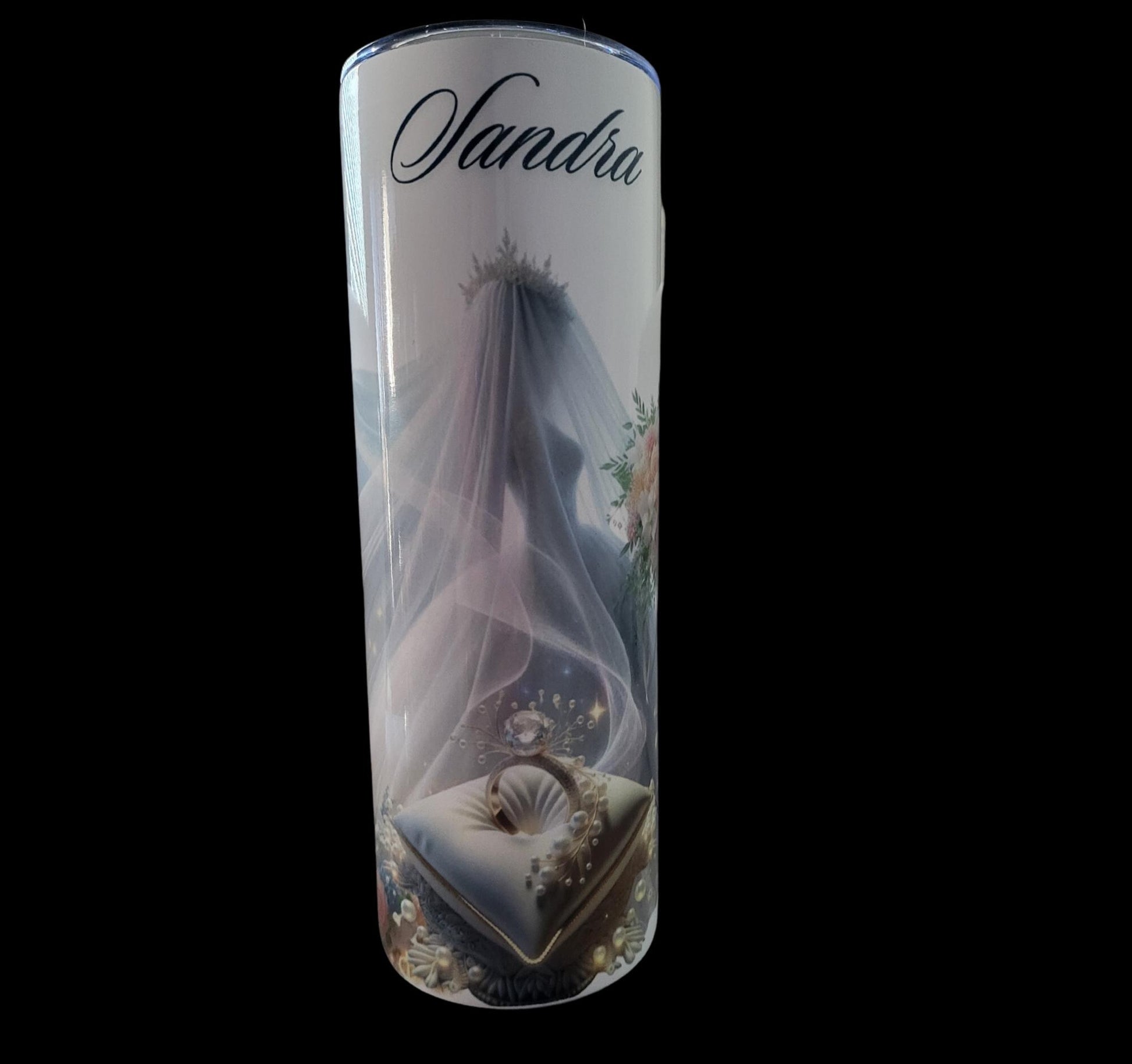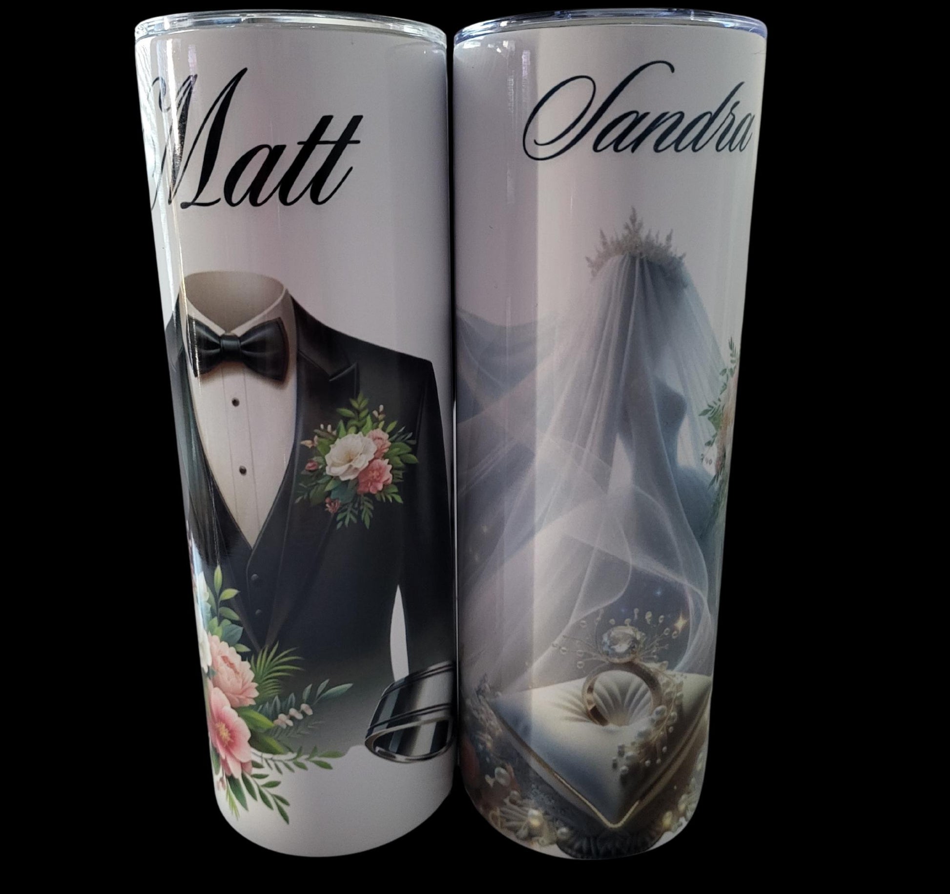 Celebrate your special day with these elegant personalized wedding tumblers. This stunning set of 20 oz insulated travel cups features a sophisticated bride and groom design - one tumbler showcasing a classic tuxedo with bow tie and floral accents, while the other displays a graceful bridal veil and ring motif. Each tumbler can be customized with names, making them perfect keepsakes for the newlyweds. The double-wall insulation helps maintain your beverage temperature, whether hot or cold, making these tumblers practical for daily use long after the wedding day. The sleek, durable design includes a clear, secure lid for convenient sipping on the go. These beautiful tumblers make thoughtful wedding gifts, engagement presents, or special additions to your own wedding festivities. The high-quality printing ensures the elegant designs will continue looking beautiful use after use.